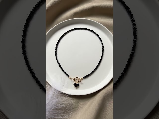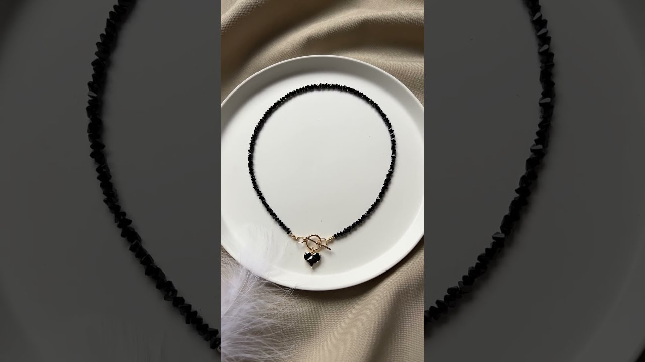 Колье из черного хрусталя, размер бусин 4 мм, основа - ювелирный тросик, длина колье 40 см. Фурнитура премиум класса, латунь с покрытием позолоты 24 карата, не темнеет. Подвеска - черное хрустальное сердце.