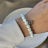 Armband Schutzamulett aus natürlicher Angelit mit Hand der Fatima. Stein-Durchmesser 8 mm. Farbe grün-blau. Basis - doppeltes starkes Gummiband.