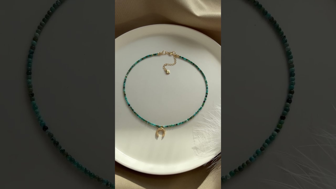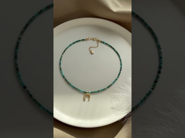 Чокер из камня бирюза с подвеской «золотая лунница» — это изысканное украшение, в котором сочетаются природная красота натурального камня и древняя символика. Насыщенный бирюзовый оттенок камня освежает образ, а золотая лунница становится акцентной деталью, придавая чокеру особый смысл и глубину.