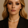 - Лаконичность и утонченность: Чокер из белого жемчуга подчеркивает линию шеи и ключиц, добавляя образу элегантности без излишней вычурности. Это делает его идеальным аксессуаром для минималистичных образов.