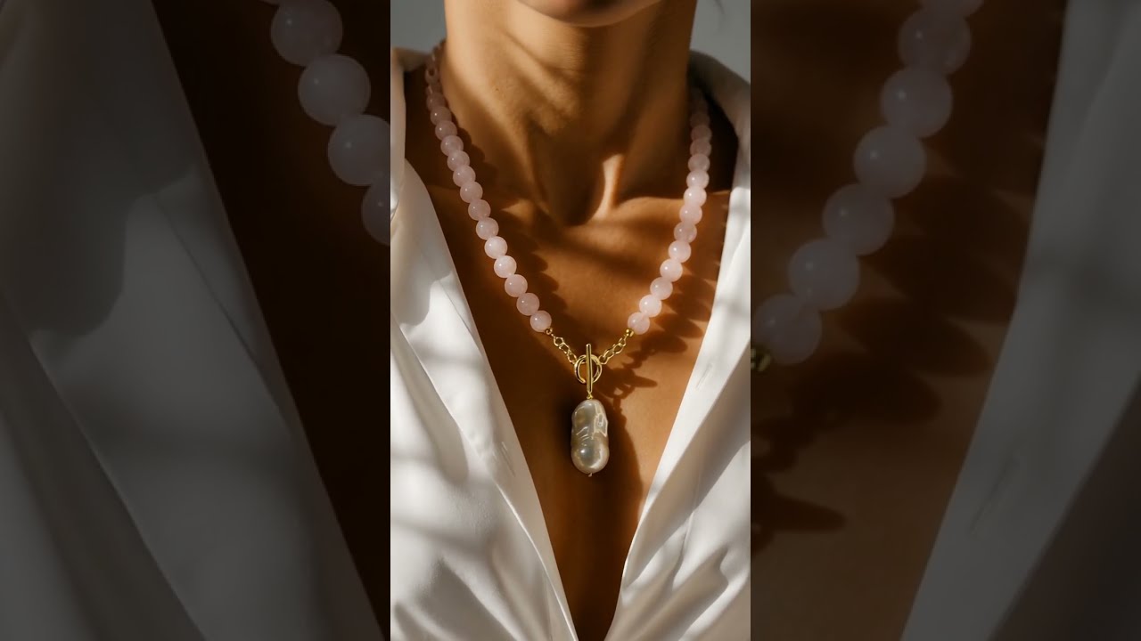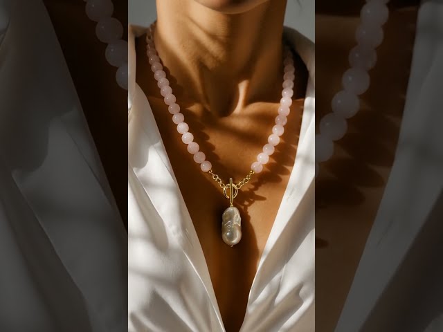 Бусы из натурального камня розовый кварц. Диаметр бусин - 6 мм. Основа - ювелирный тросик. Подвеска - жемчужина, фурнитура премиум класса, не темнеет. Латунь с покрытием позолота 24K. Длина бус 47см.