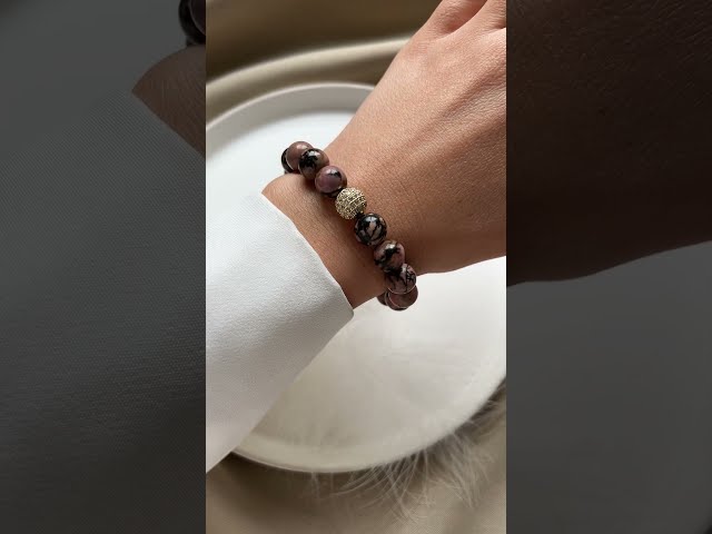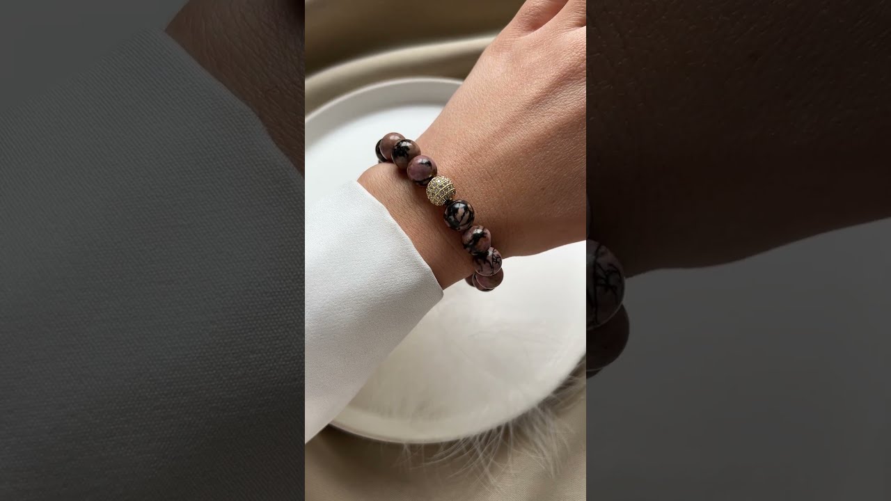 Ein Armband aus natürlichem rosa Rhodonit. Die Perlen haben einen Durchmesser von 10 mm. Die Verschlüsse sind aus hochwertigem Messing mit einer 24-karätigen, anlaufbeständigen Vergoldung. Das Armband ist aus strapazierfähigem Elastikmaterial gefertigt und 16 cm lang.