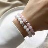 Данный набор браслетов изготовлен из камней натурального розового кварца и белого нефрита. Вставка - бусина. Женские украшения из натуральных камней натурального розового кварца обладают некоторыми магическими свойствами: приводят к гармонии, усиливают вибрации намерения, способствуют достижению целей, позволяют углубиться внутрь себя, помогают принимать важные решения, избавляют от страха, очищают пространство от негативной энергии, помогают обрести спокойствие, приводят к душевному равновесию. Также изделия из кварца помогают наладить разногласия в семье, оберегают сложную беременность, лечат бессонницу, помогают обрести семейное счастье незамужним. Нефрит имеет влияние на духовное развитие, рациональность, удачу, укрепление отношений, финансы.