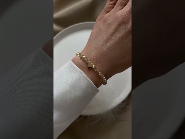 Хрустальный браслет цвета шампань с бусиной в форме сердца — это изысканное украшение, которое сочетает мягкое сияние кристаллов и романтичный символ любви. Нежный оттенок шампань придаёт браслету особую элегантность, а блеск хрустальных бусин красиво отражает свет, создавая эффект деликатного мерцания.