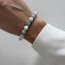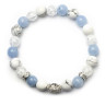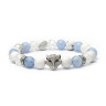 Armband aus natürlichen Steinen Aquamarin, Kristall, Chalcedon. Einlage - Perle in Form eines Panthers, Zirkonia-Steine. Steindurchmesser 8 mm. Farbe - blau, weiß, Silber.