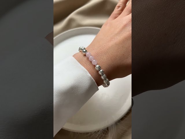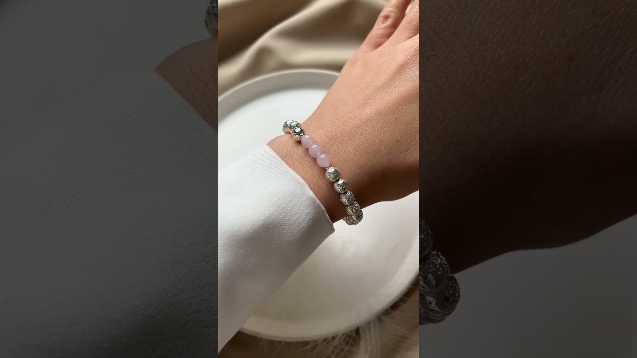 Браслет из натурального камня вулканическая лава. Диаметр бусин - 6 мм. Цвет серебро. Основа - двойная прочная резинка. Вставка- розовый кварц.
