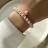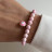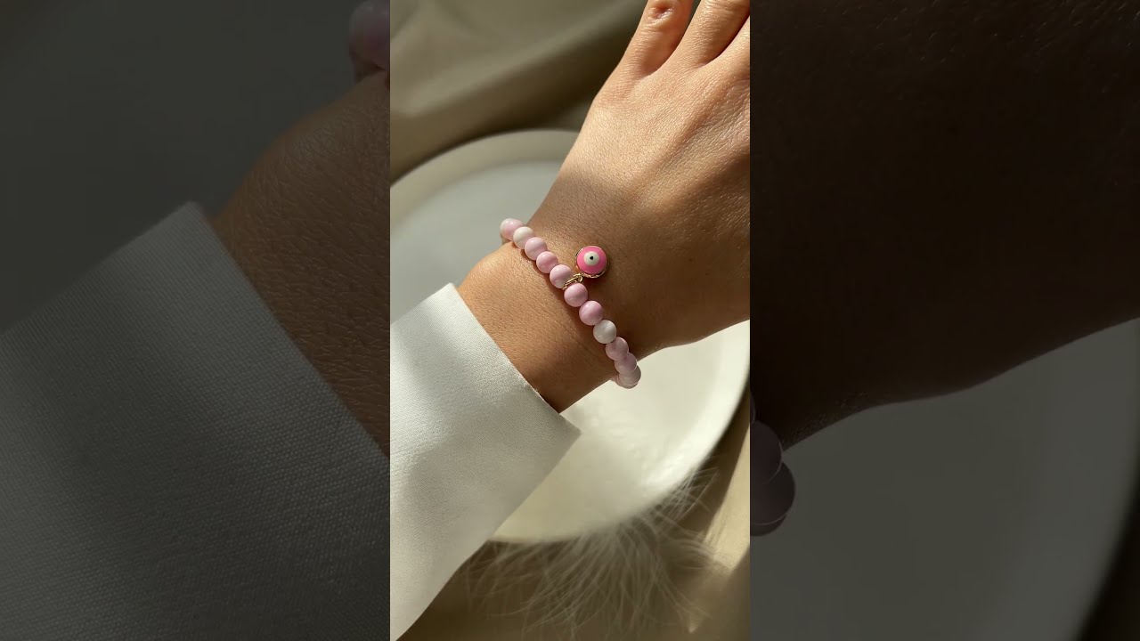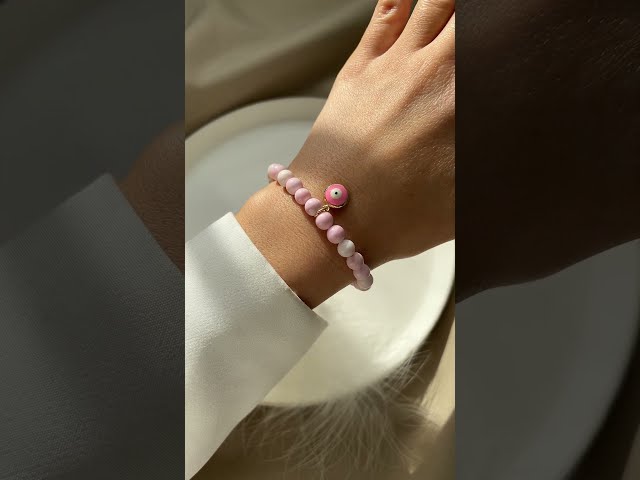 Armband aus natürlichem rosa Opal mit Anhänger - Auge. Perlen-Durchmesser 6 mm. Doppelte starke Gummibasis. Luxusklasse-Hardware, 24K vergoldete Messingteile.