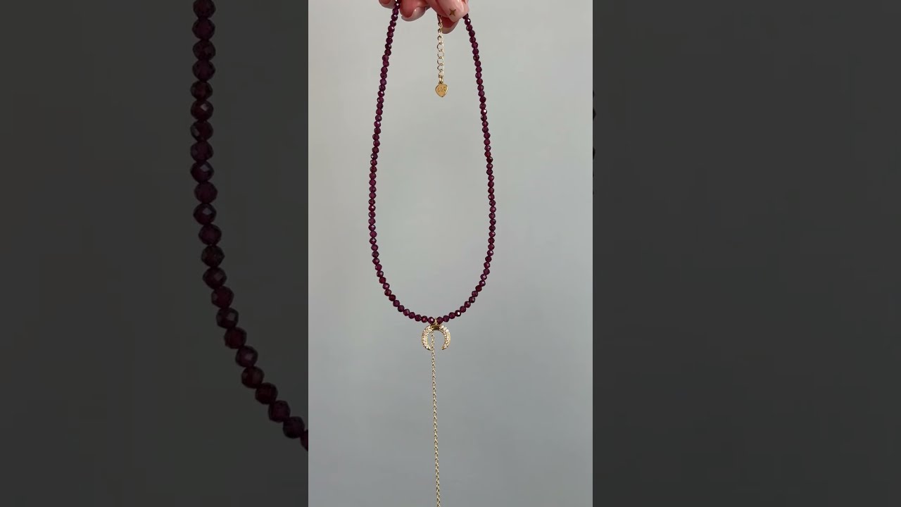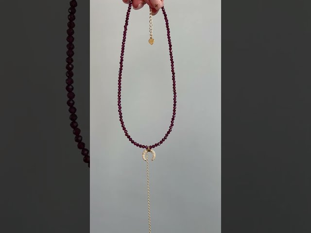 Кольє з натурального каменю гранат, розмір бісеру 3 мм, основа - ювелірний трос. Підвіска - лунниця з фіанітами. Фурнітура преміум якості, фіаніти. Довжина чокера 36 см + подовжувач. Довжина ланцюжка-краватки -13 см.