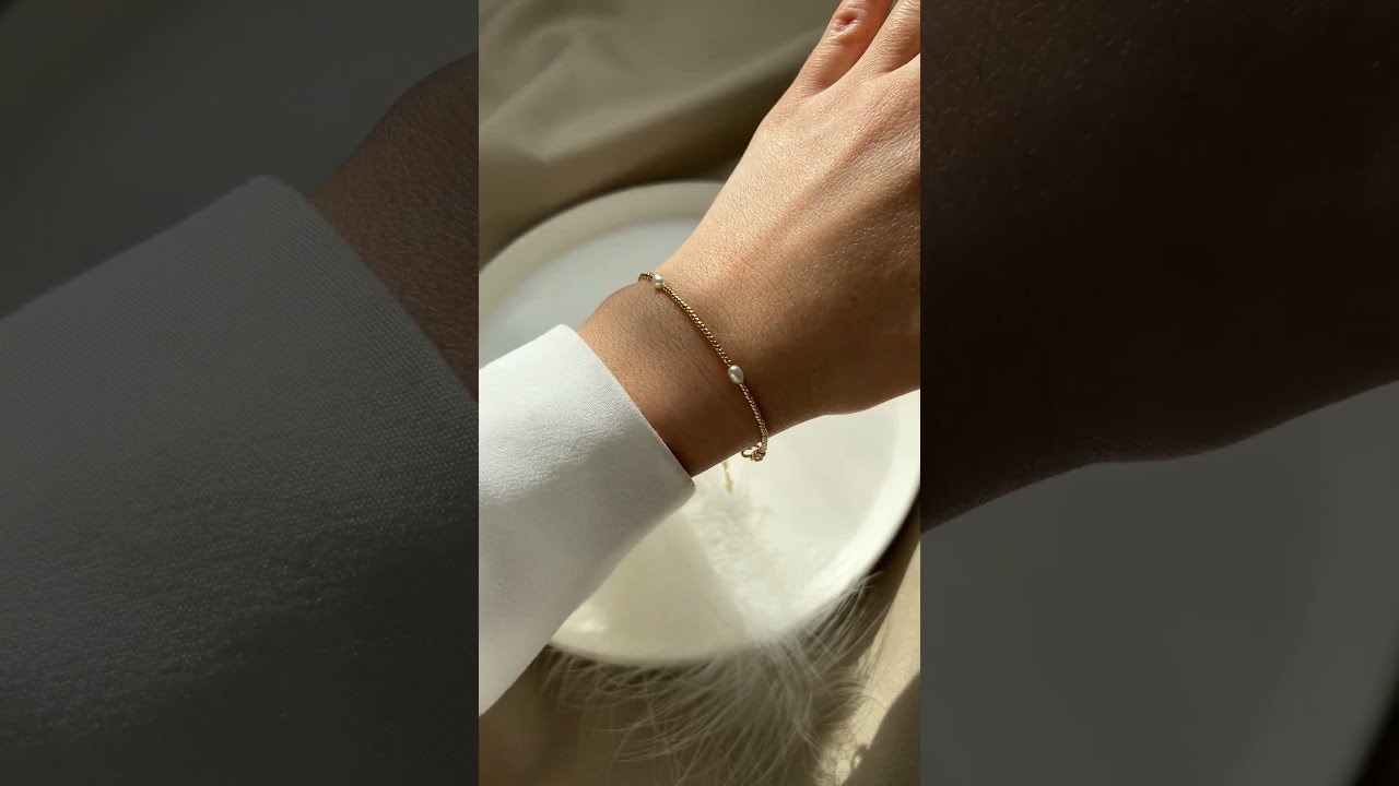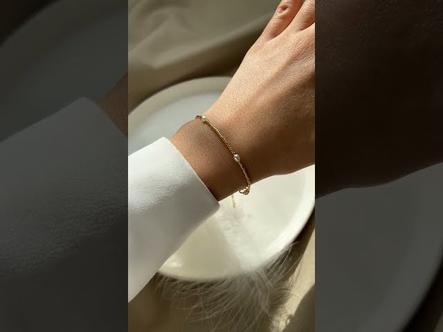Armband aus japanischen Perlen. Perlendurchmesser: 1 mm. Farbe: Gold. Basis: Schmuckkabel. Beschläge: Messing mit 24-Karat-Vergoldung. Armbandlänge: 15 cm + 6 cm Verlängerung.